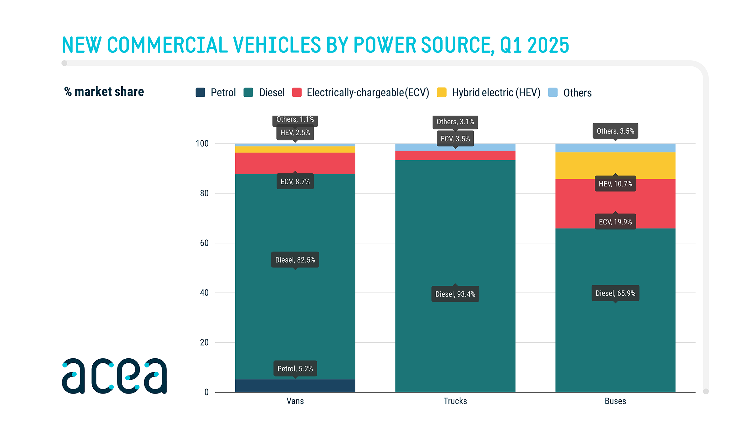 New commercial vehicle registrations: vans -12.2%, trucks -16%, buses -1.8% in Q1 2025