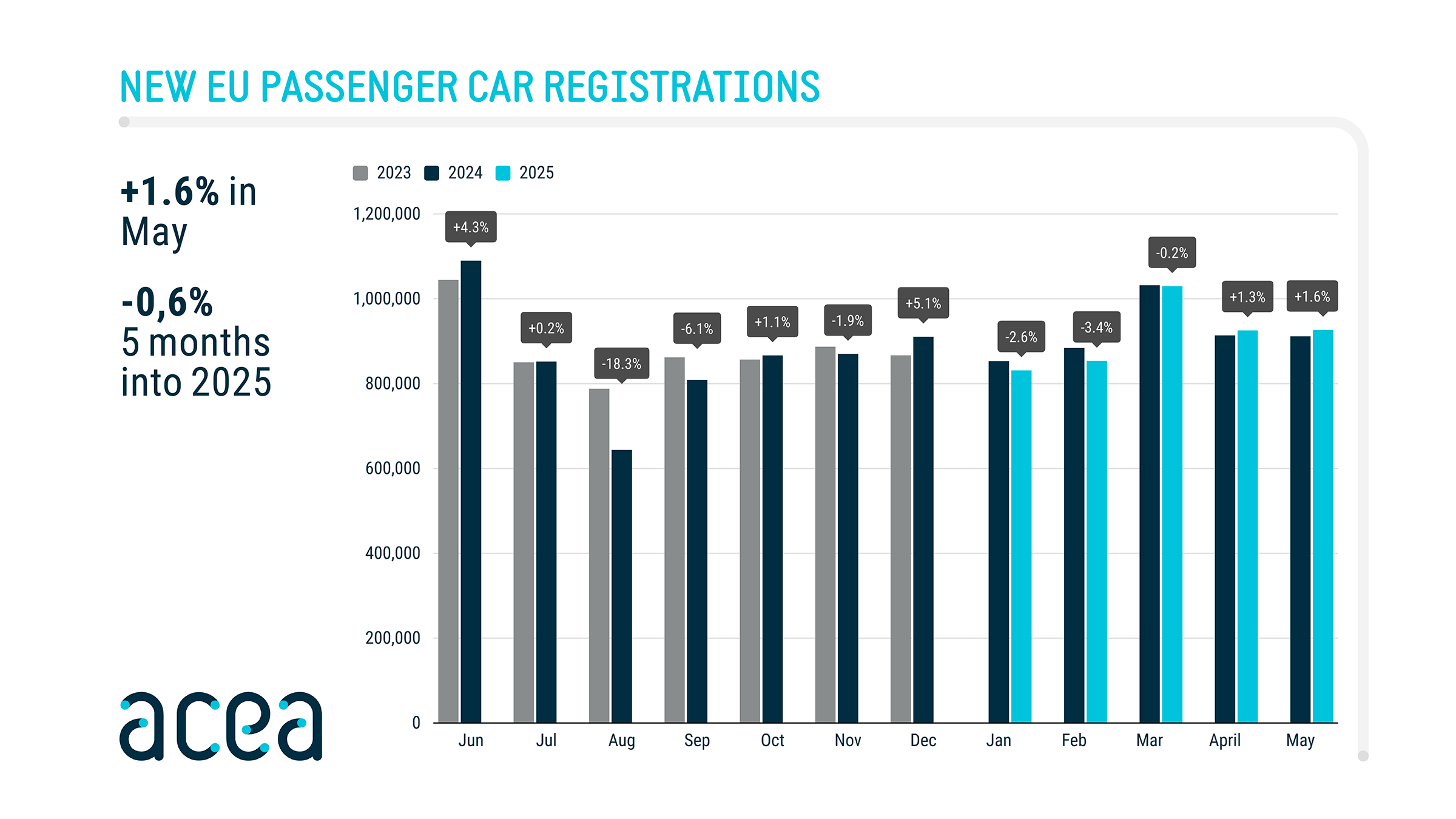 In May 2025 year-to-date (YTD), new EU car registrations fell by 0.6% compared to the same period last year. Nonetheless, year-on-year (YOY) registrations for May increased by 1.6% compared to the same month last year.