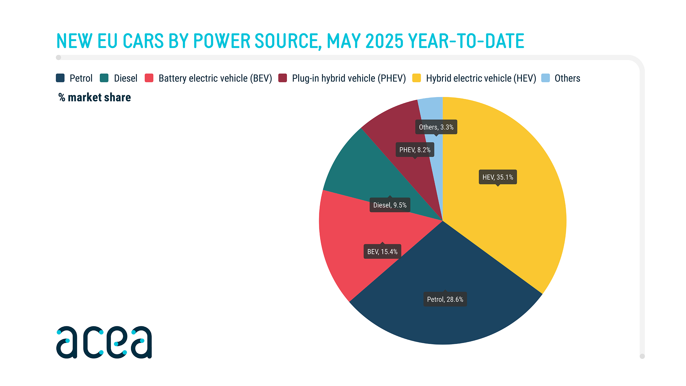 The battery-electric car market share for May 2025 YTD stood at 15.4%, still far from where it needs to be. Hybrid-electric models continue to grow in popularity, retaining their place as the most popular power type amongst buyers.
