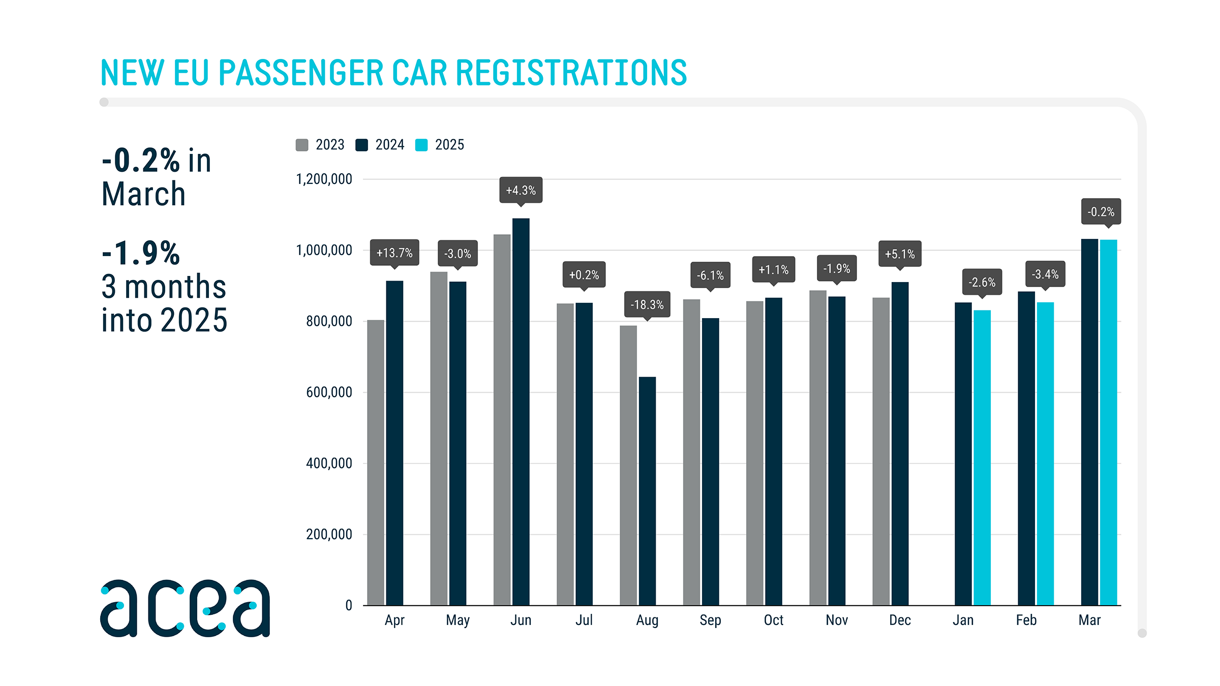In Q1 2025, new EU car registrations declined by 1.9% compared to Q1 2024, with March 2025 figures showing a slight 0.2% year-on-year (YOY) decline as the global economic context remains particularly challenging and unpredictable for auto makers.