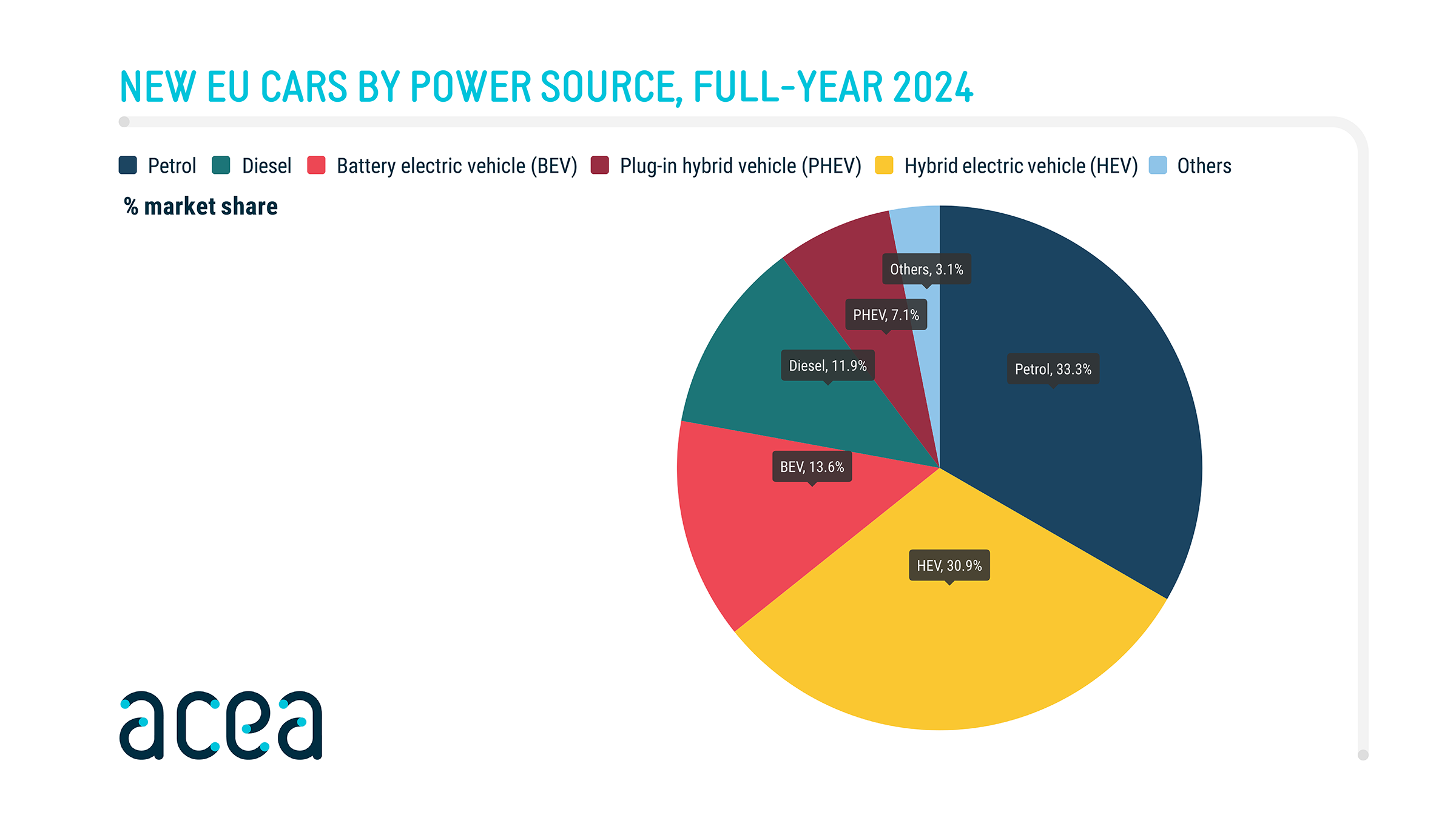 Battery-electric cars remained the third-most-popular choice for buyers in 2024. In December, their market share stood at 15.9%, contributing to a 13.6% share for the full year, again surpassing diesel, which declined to 11.9%. Petrol cars retained their lead at 33.3%, while hybrid-electric cars strengthened their second position, commanding a 30.9% market share.