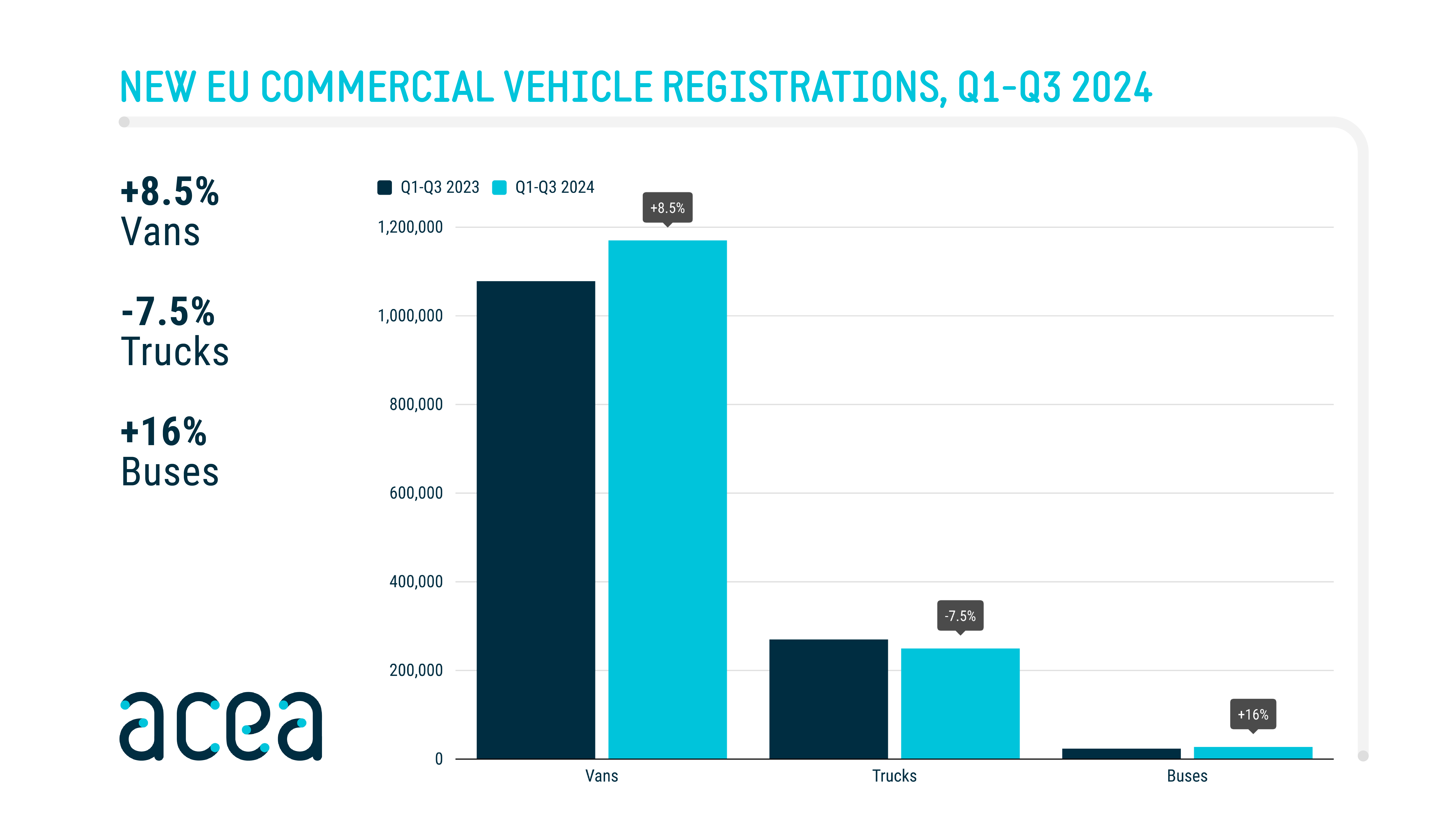 New commercial vehicle registrations: vans +8.5%, trucks -7.5%, buses +16% in the first three quarters of 2024